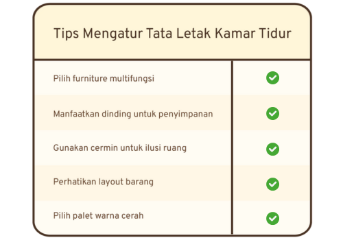 Menciptakan kamar tidur yang nyaman dan hemat ruang tidak perlu rumit. Dengan menerapkan tips di atas, Anda bisa mendapatkan tata letak kamar tidur yang indah, fungsional, dan sesuai dengan kebutuhan Anda.