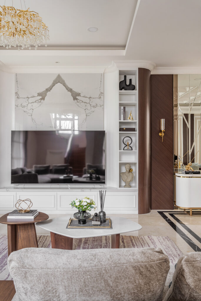 Penggunaan wall panel, pintu berpola, dan langit-langit bertingkat menambah kedalaman visual dan karakter klasik yang kuat. -