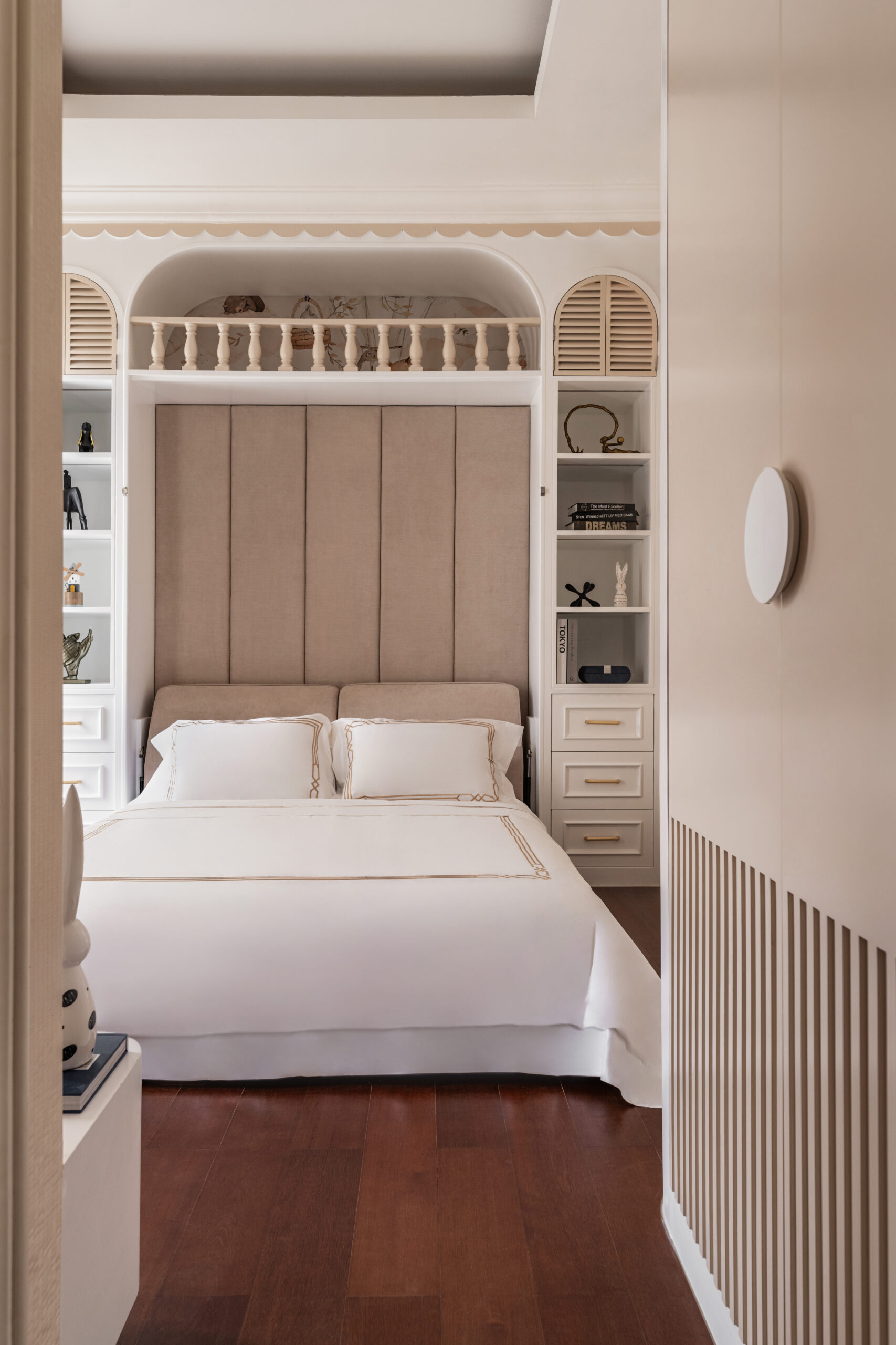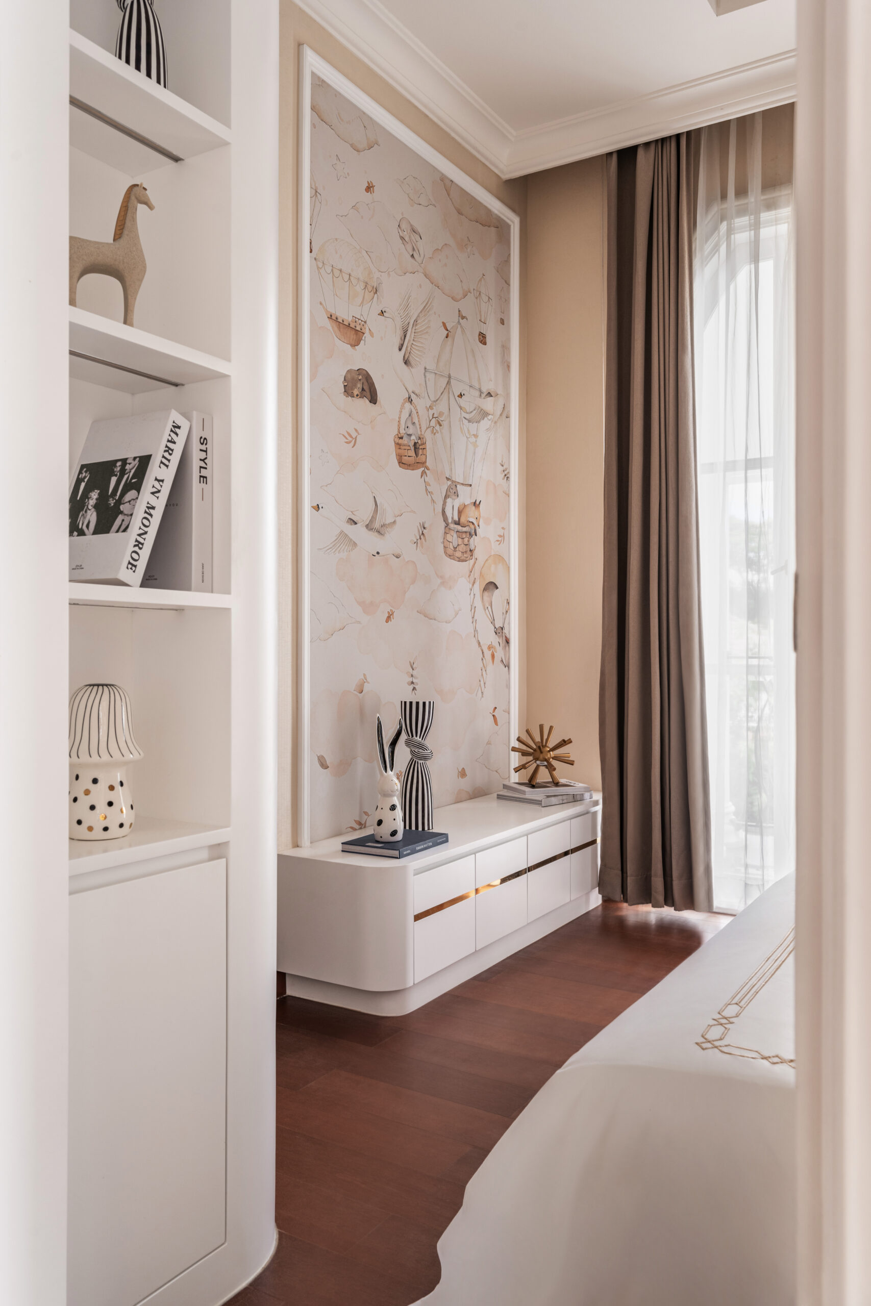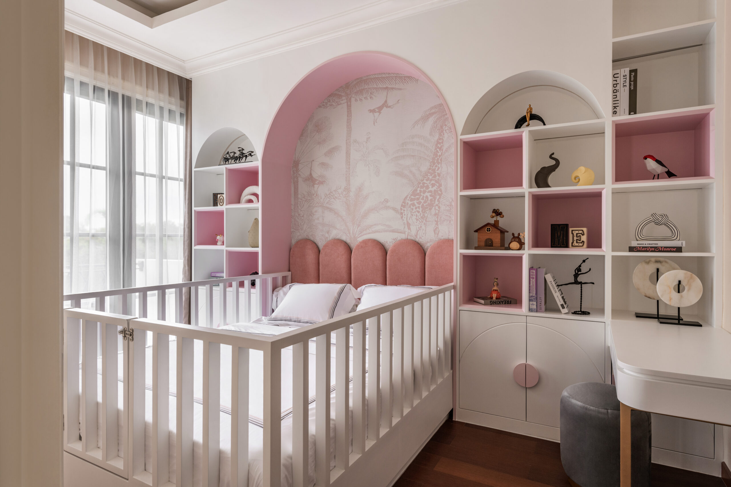 Kamar anak dibuat dengan tema lembut dan playful — lengkungan, wallpaper ilustratif, dan rak display menampung koleksi mainan & dekor favorit mereka.