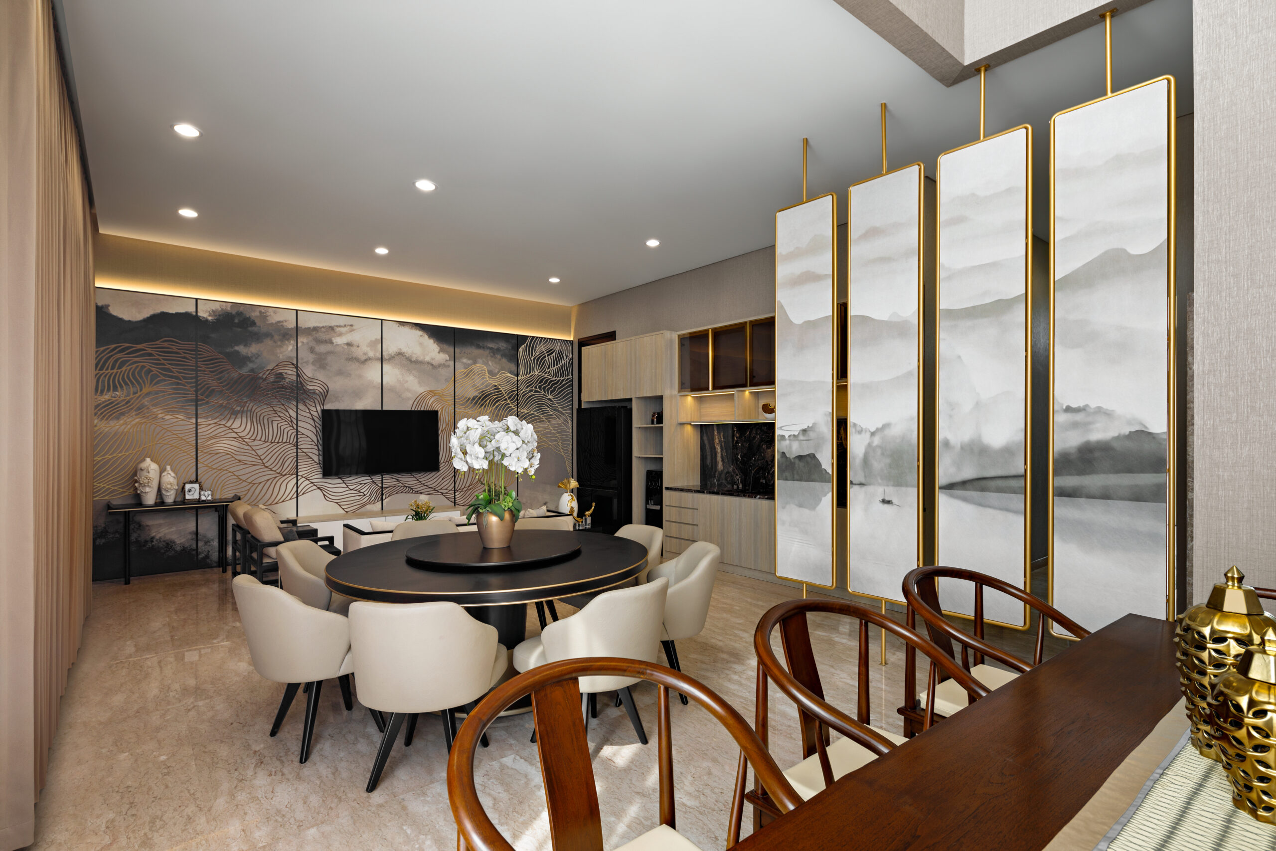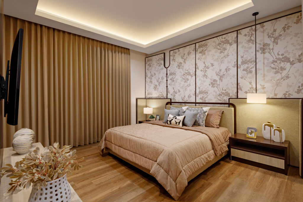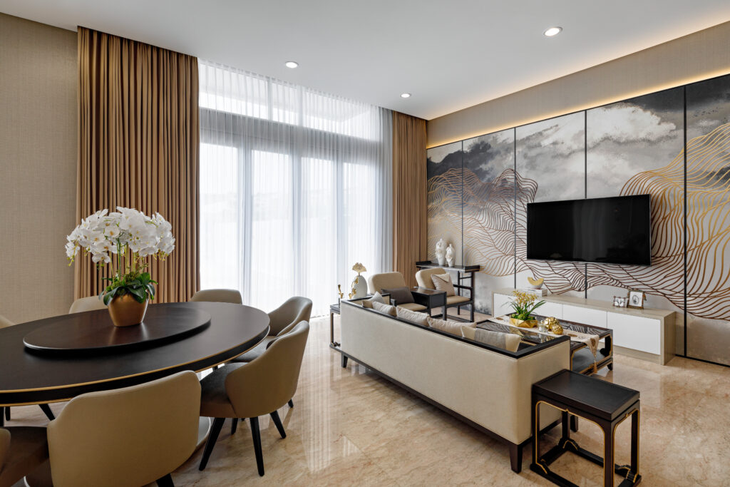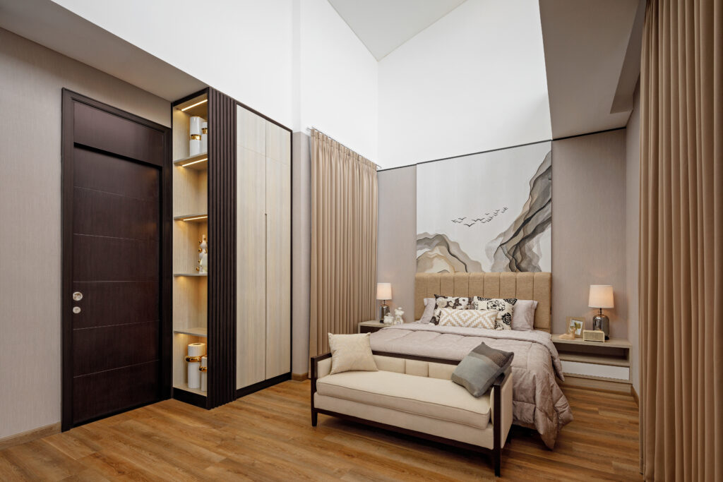 Perpaduan beige, cokelat kayu, abu-abu lembut & gold accents menciptakan ambience cozy dan mewah secara bersamaan. -