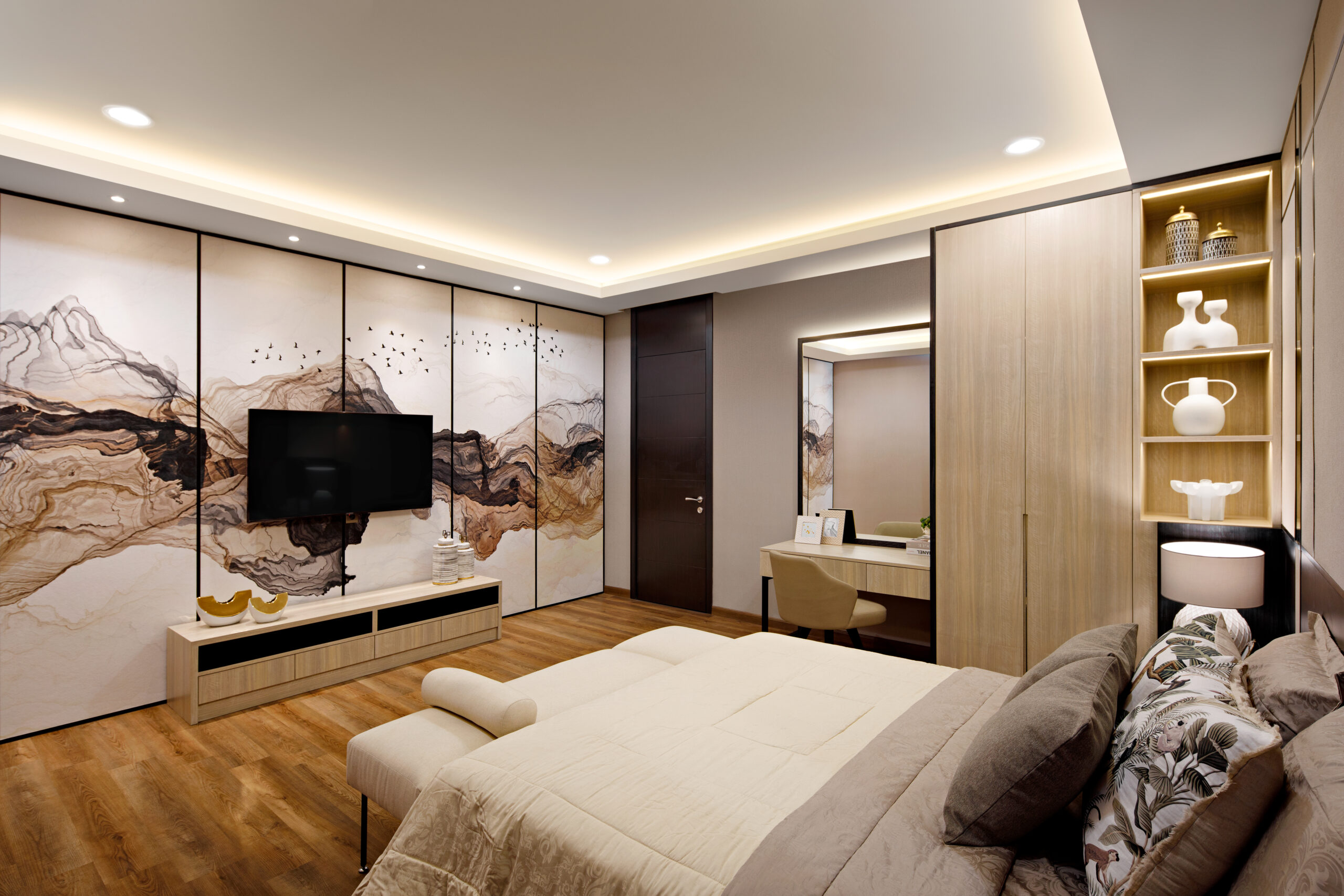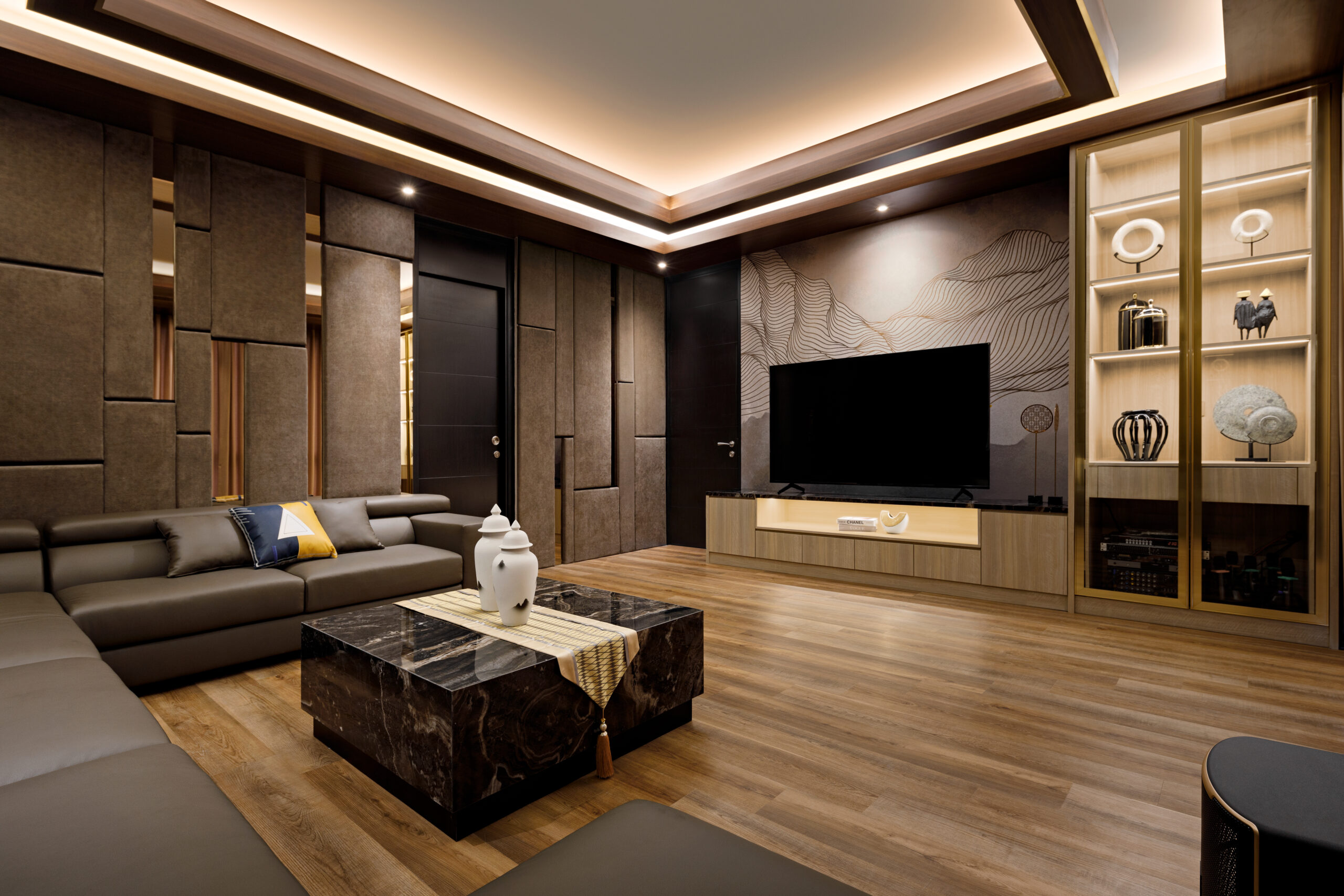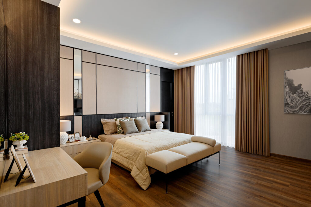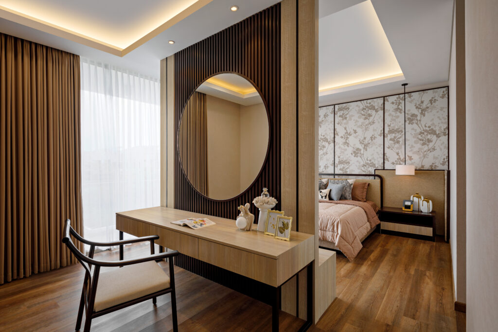 Perpaduan beige, cokelat kayu, abu-abu lembut & gold accents menciptakan ambience cozy dan mewah secara bersamaan. -