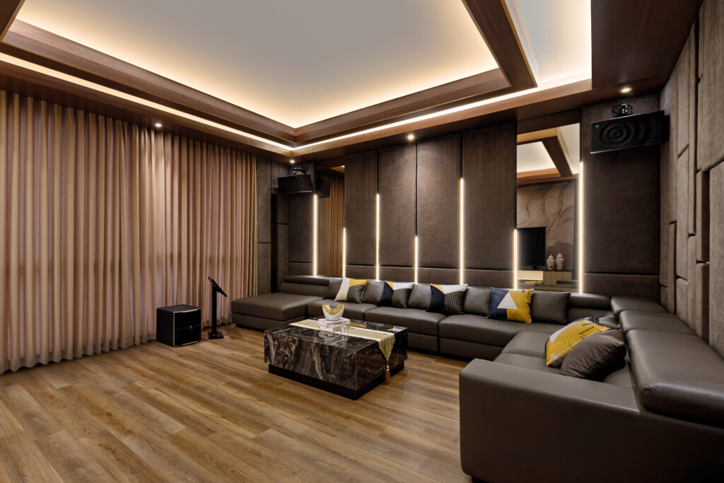 Wall paneling, cornice, mirror panel, dan pemilihan furnitur plush meningkatkan keutuhan desain dan mempertegas karakter luxury. -