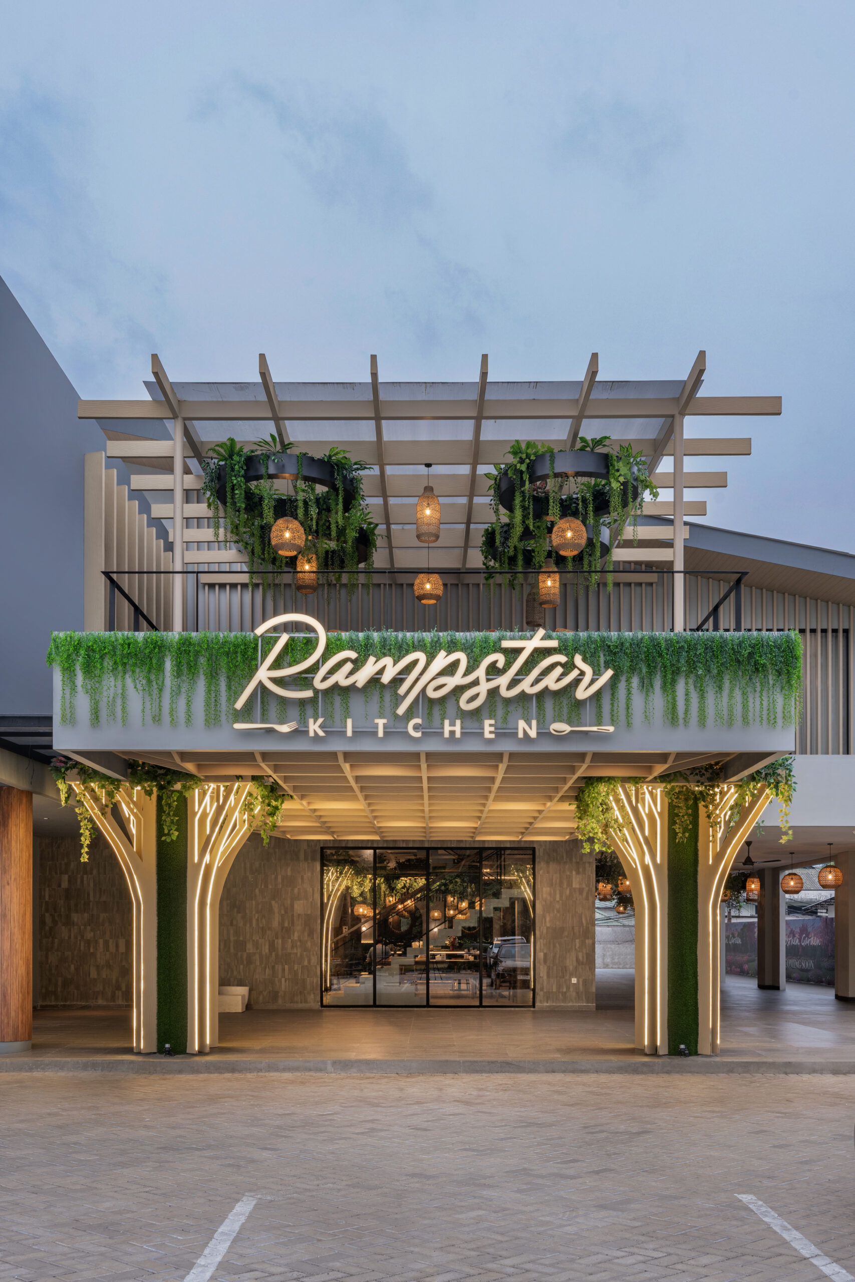 Fasad mencolok dengan komposisi arch, kolom klasik, dan jendela simetris menciptakan tampilan estetik yang megah. Begitu masuk ke interior, suasana bergeser ke kehangatan modern dengan palet warna netral, material premium, dan area open-plan yang memudahkan aktivitas keluarga.