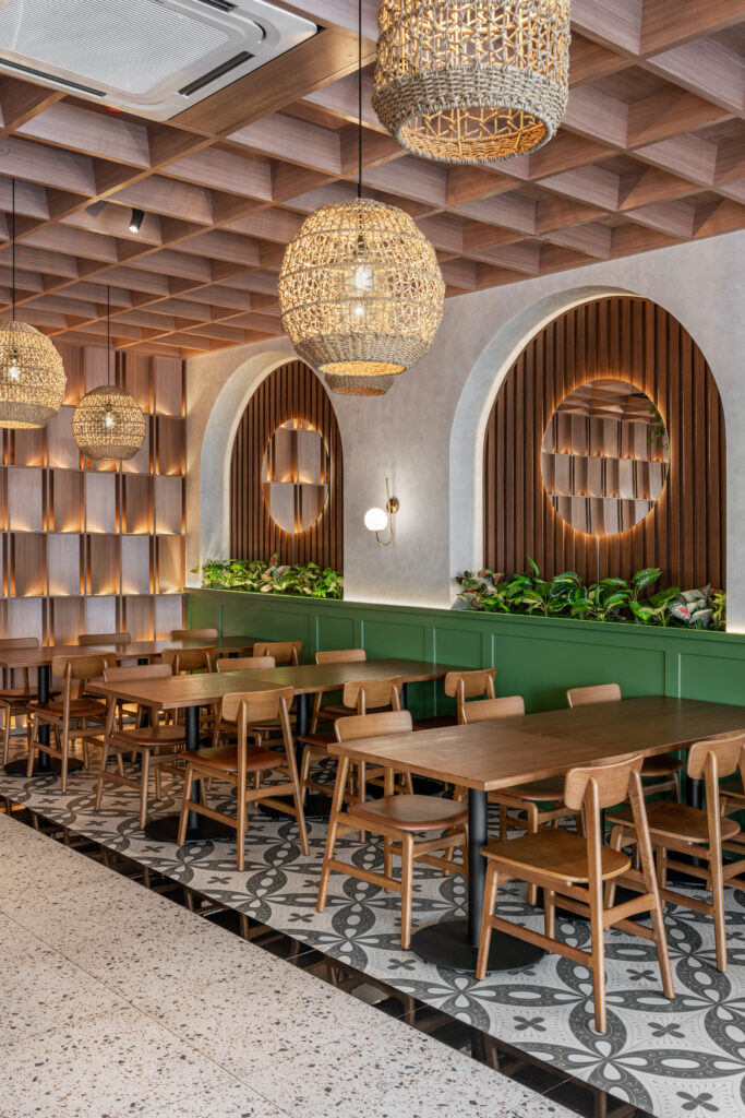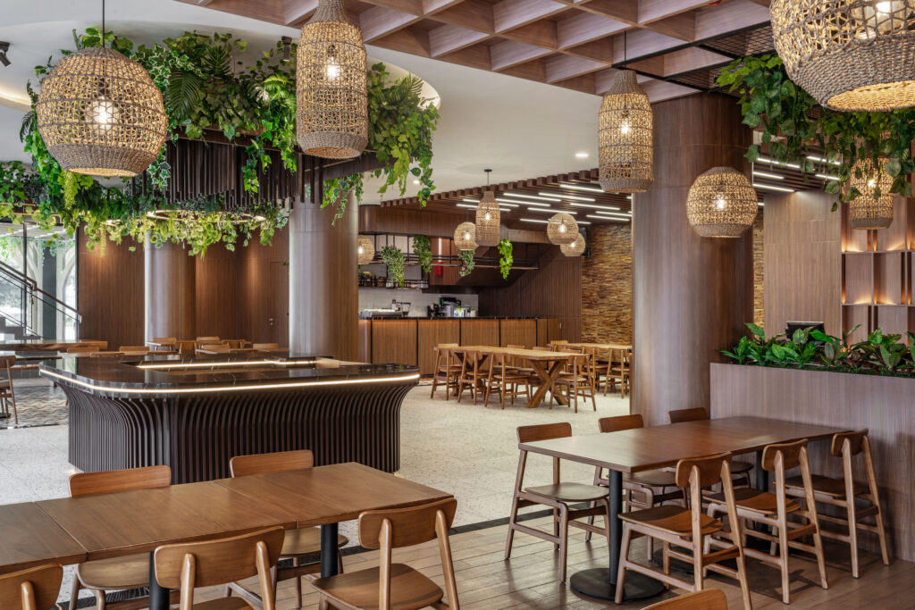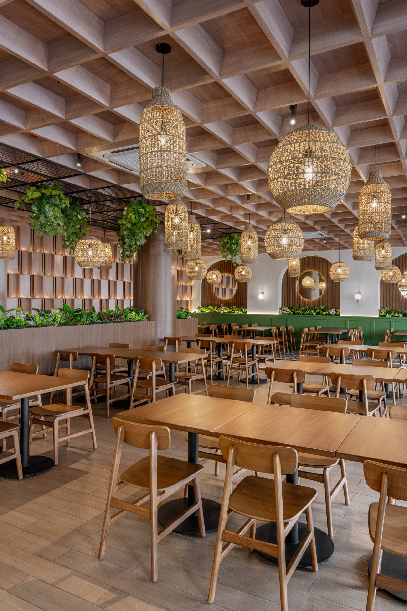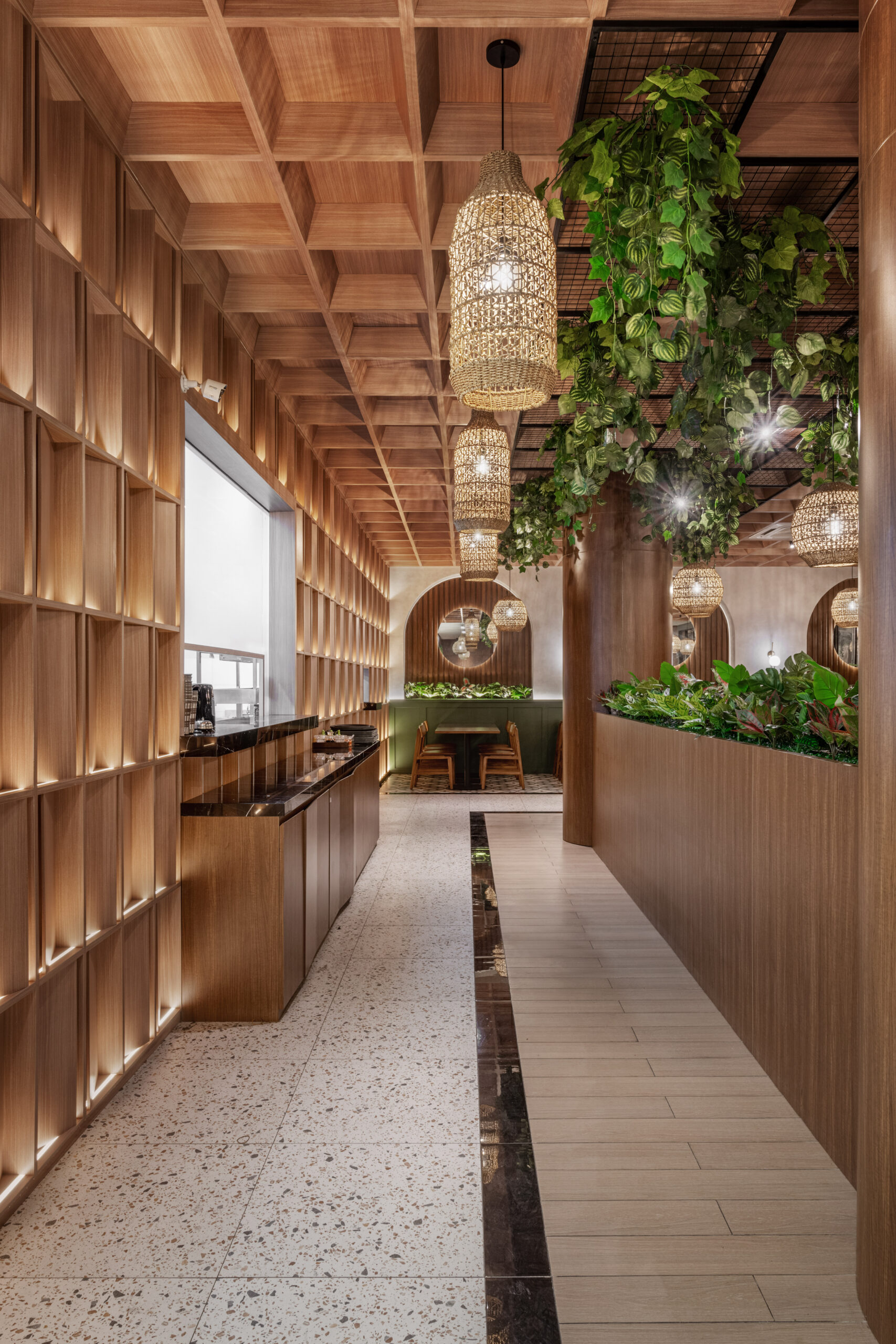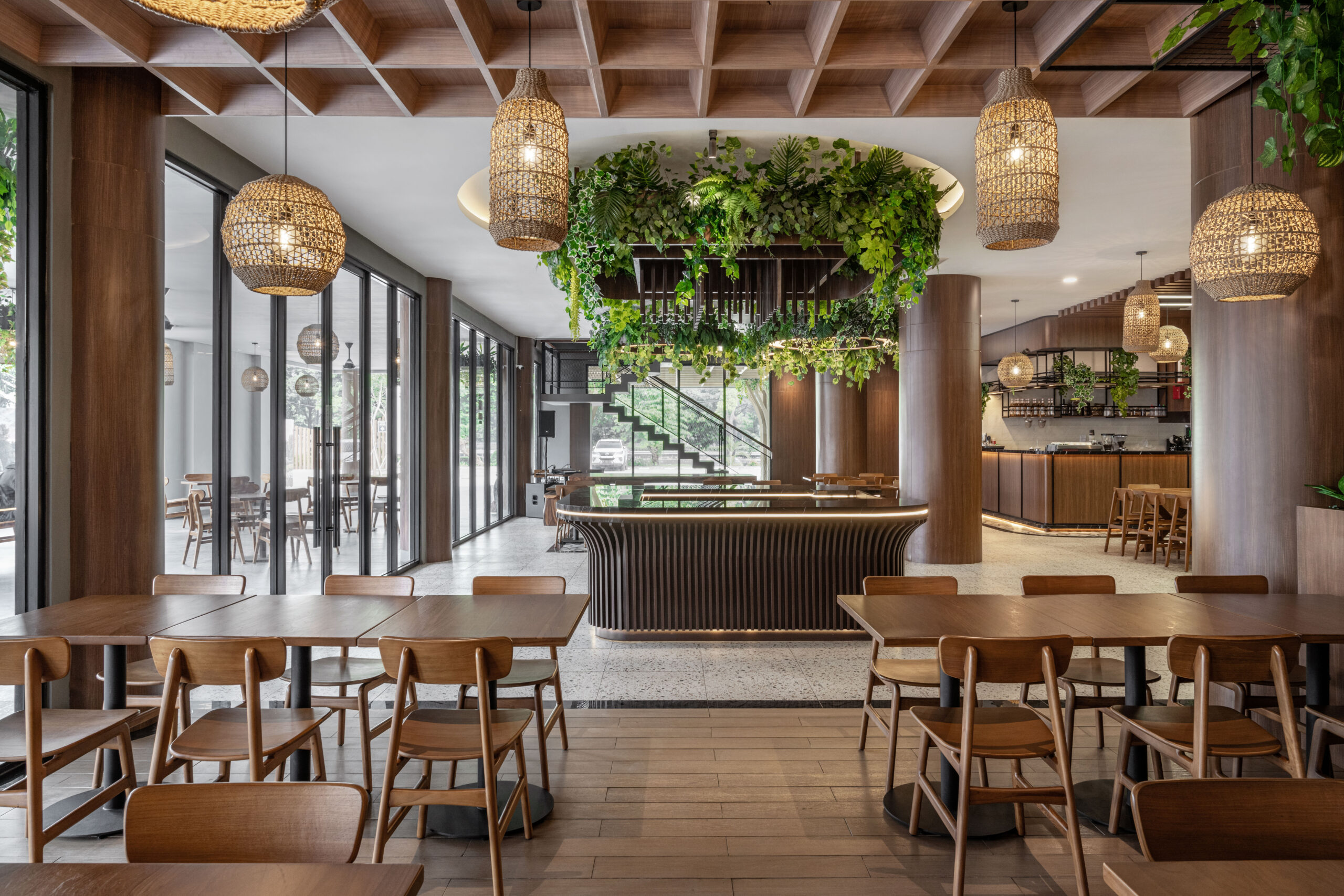 Struktur kisi-kisi kayu di langit-langit memberikan ritme visual yang menenangkan dan menciptakan suasana resort tropis. -