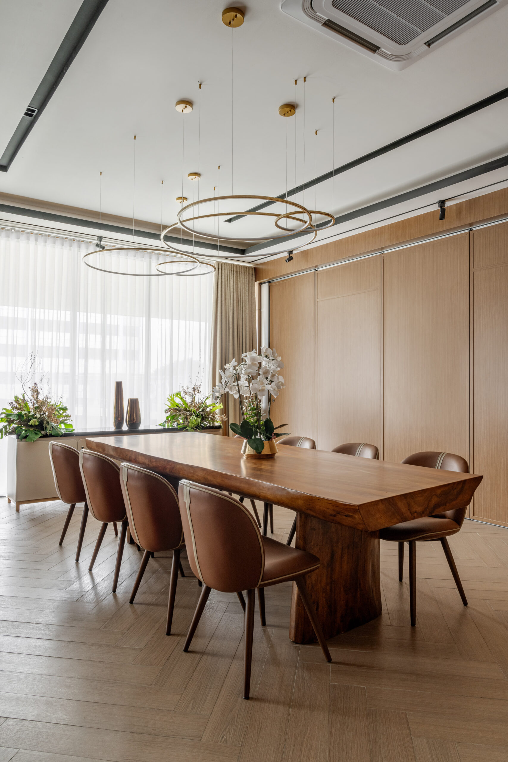 Ruang eksklusif dengan desain kayu dan pencahayaan premium untuk meeting, intimate event, atau fine dining experience. -