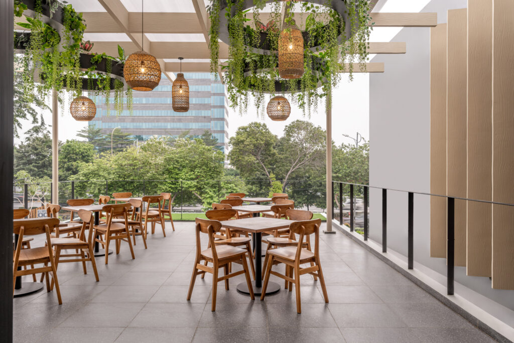 Area semi-outdoor dengan pemandangan kota dan tanaman tropis untuk suasana santai dan natural breeze.